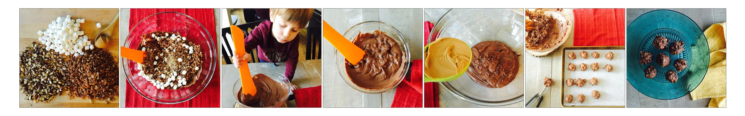 - Melt chocolate in a double boiler over simmering water until morsels have melted. Remove from heat and mix in peanut butter until fully incorporated. Add nuts, cereal and marshmallows and mix. Using a 2 teaspoon ice cream scoop, spoon out onto a parchment lined baking sheet.