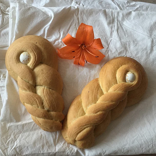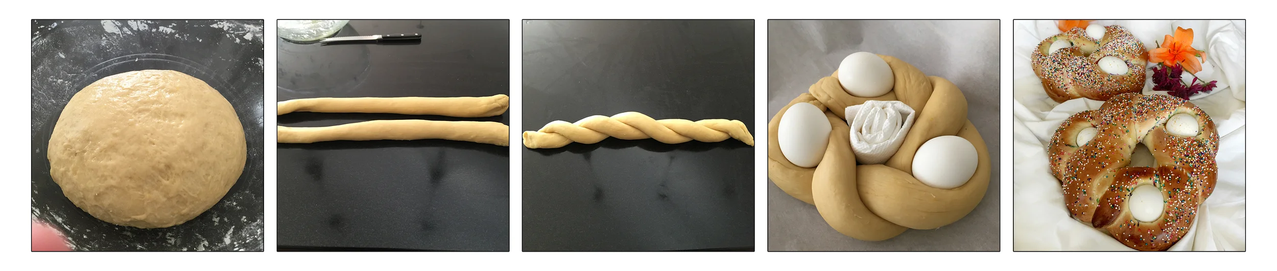 - Once it has doubled in size, cut dough into four equal pieces. Roll into log ropes and then attach two ropes and loosely braid. Tuck three eggs into the braid and place on a parchment lined baking sheet. Place a ball of paper towel in the middle to maintain the hole while it rises one more time, another hour.