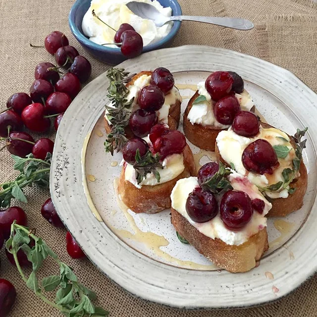 - Toast the bread and slather with ricotta while still warm. Spoon cherries over the ricotta evenly over the four pieces of bread. Garnish with thyme (optional).