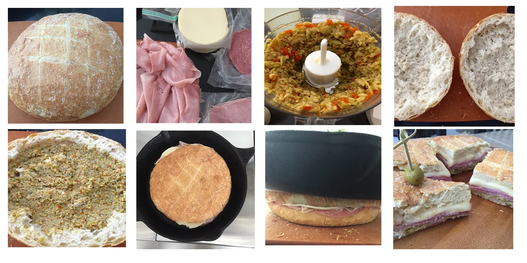 - Cut the large, round loaf along the equator and scoop out the pulp. Spread the olive salad on both sides of the bread and begin layering the ham and then salami on top of the bottom slice of bread. Layer the provolone all along the top of the meat and add bread.