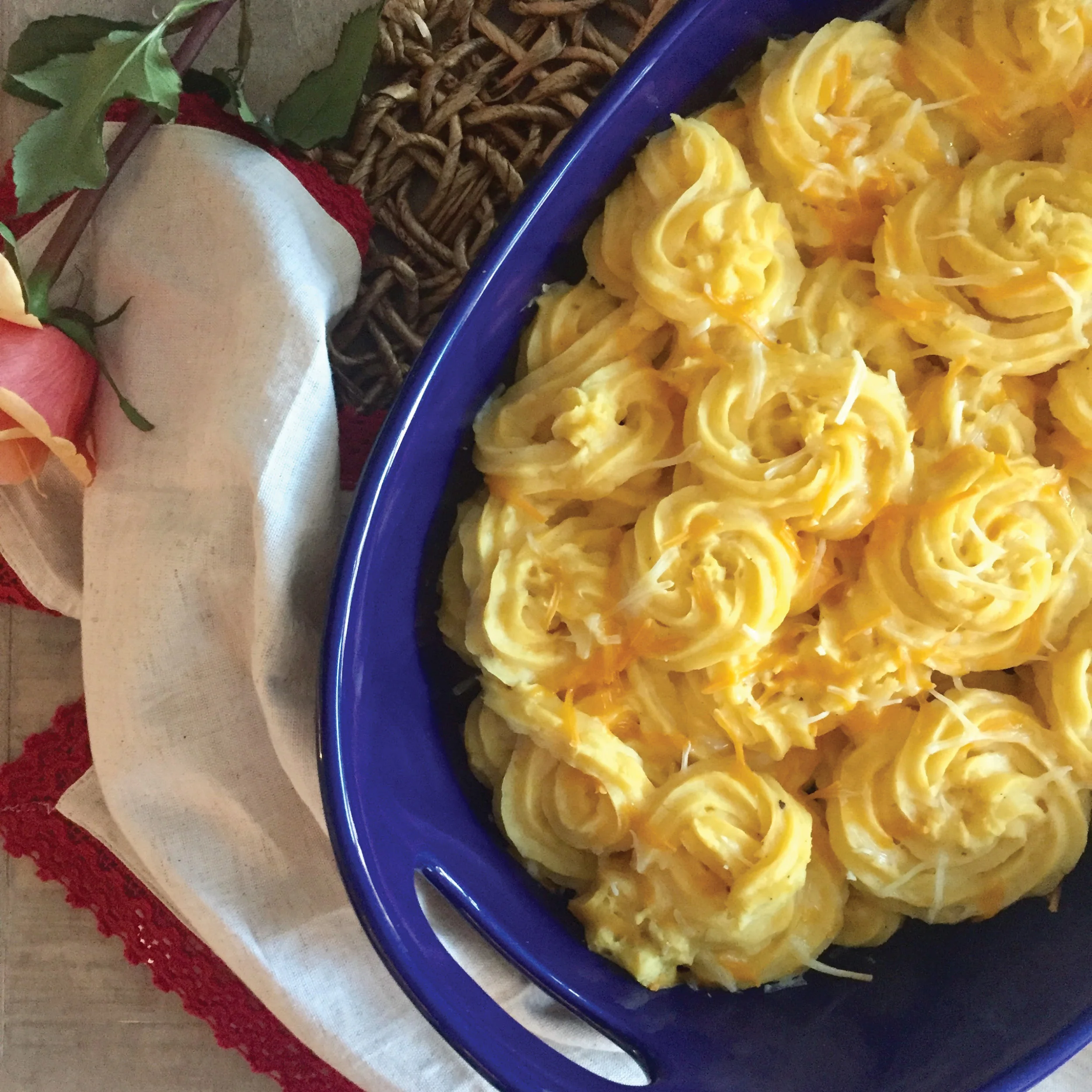 **note I placed the mashed potatoes in a piping bag and made rosettes before baking.