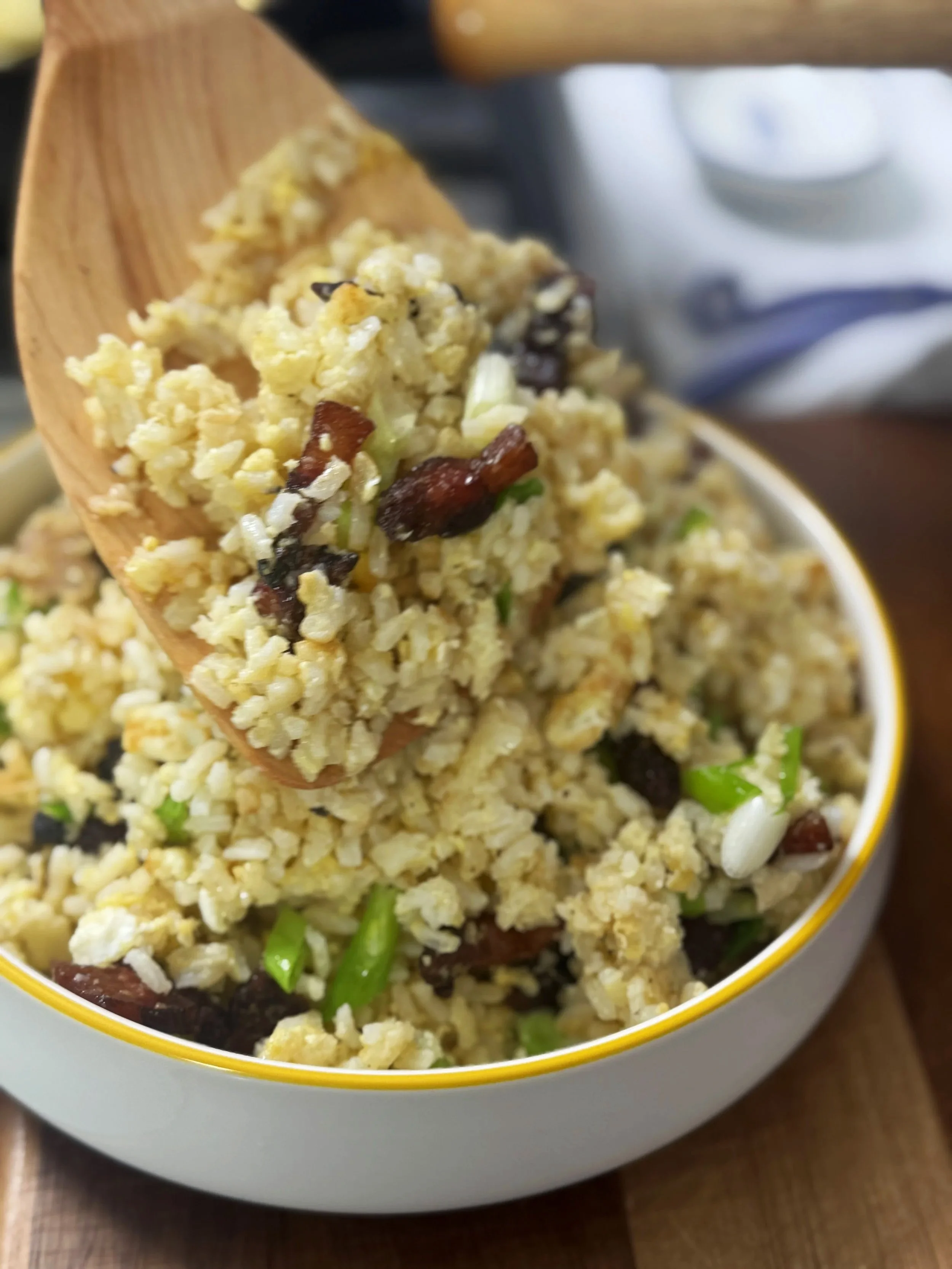 Add the rice to the wok and begin to fold it over so it heats and becomes coated in the oil. Once it has softened, push the rice up the sides of the wok. Add the last egg to the middle of the wok and sprinkle with the salt and pepper. Once it begins to cook, cut it up with the edge of the spatula and push it to the sides. Add the cooked guanciale and scallions and mix all together to combine.