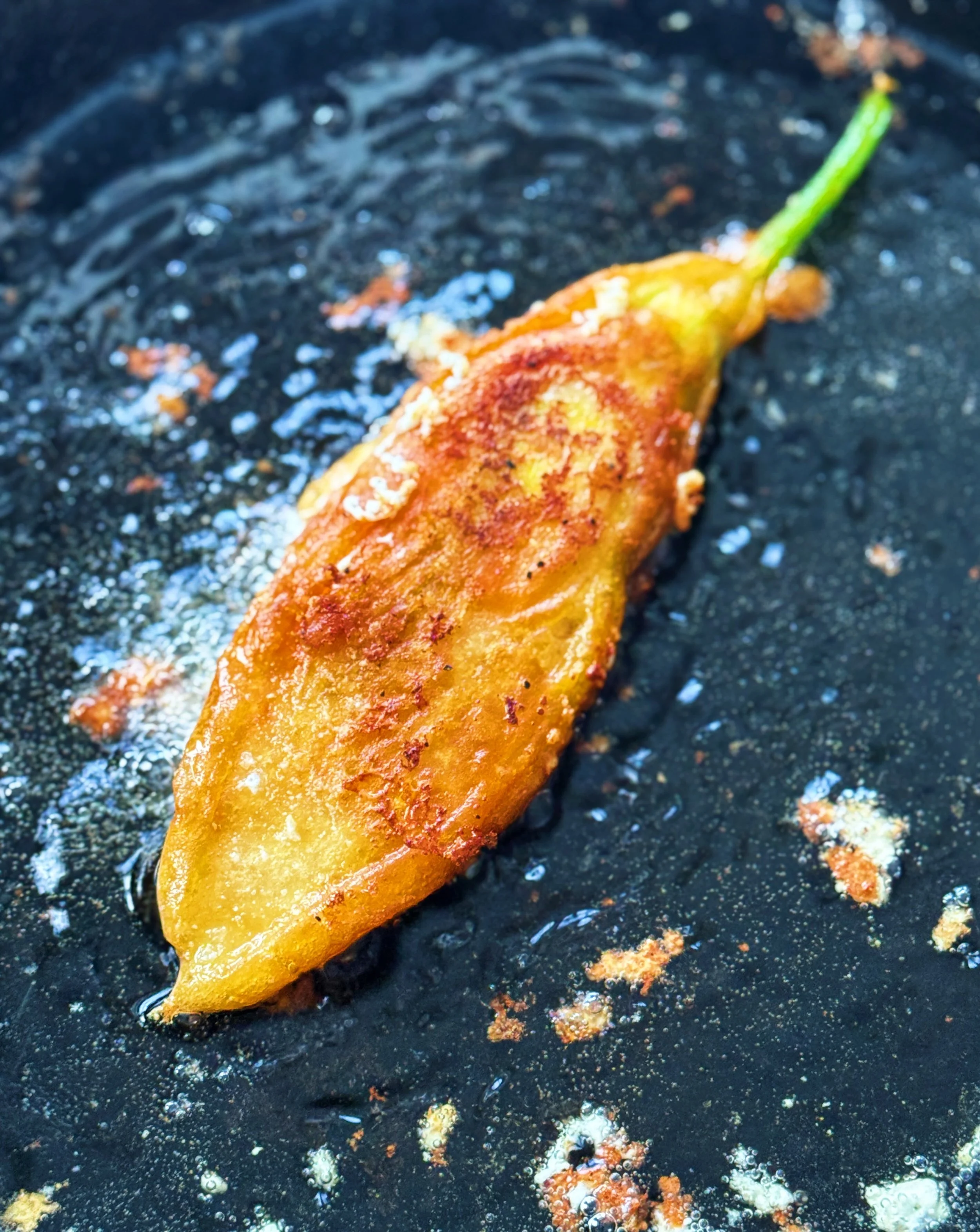 heat oil in large cast iron skillet on medium heat. once oil reaches 350 degrees, carefully dip the flowers into the batter and fry on both sides until puffed and golden brown. drain on a paper towel lined plate